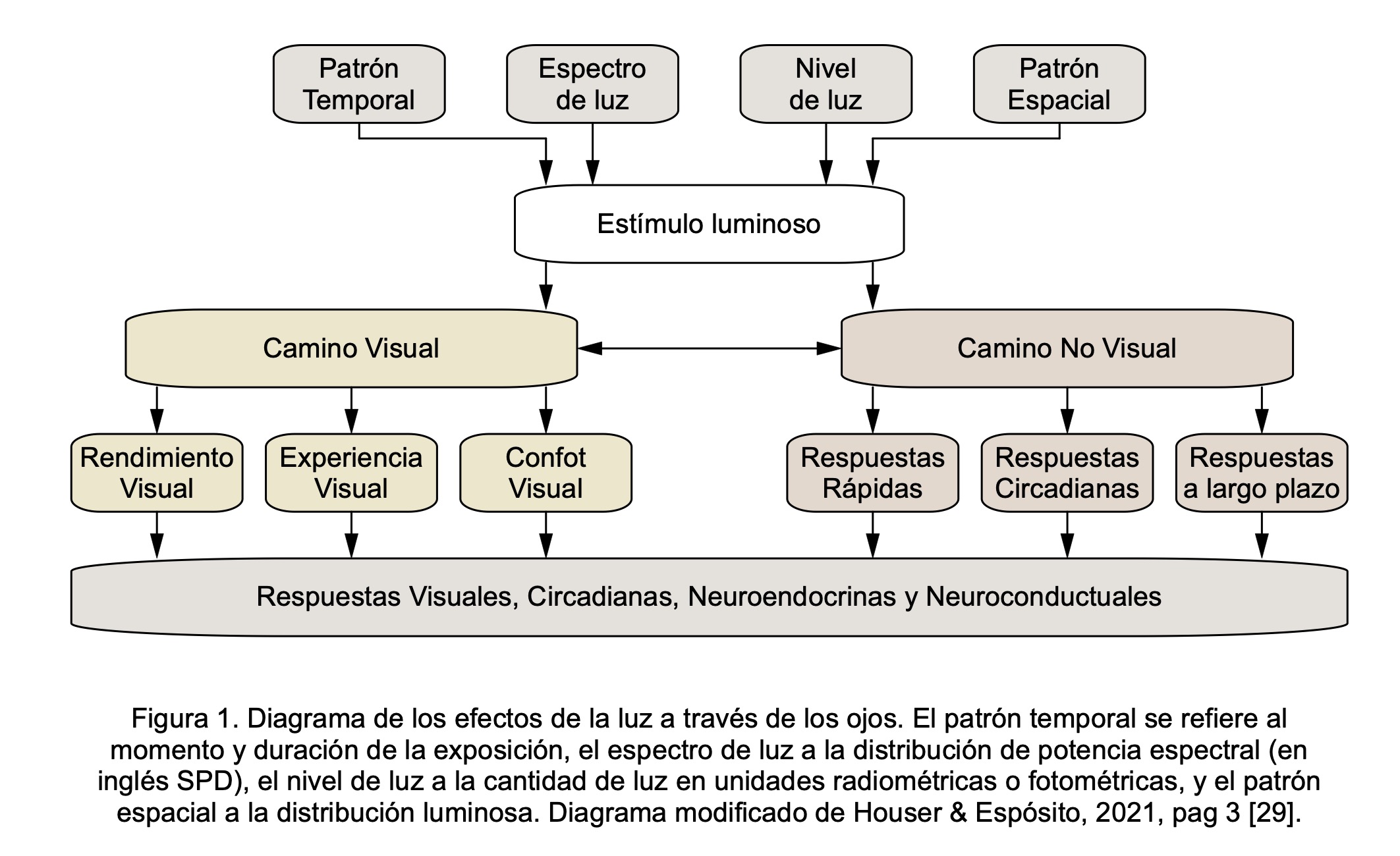 En la arquitectura la iluminación esta sujeta a requisitos específicos del proyecto y sus usuarios. Según Houser et. al. [19], el diseñador tiene el control sobre las siguientes variables de iluminación que son esenciales en la percepción no visual: la distribución luminosa, el espectro, nivel de luz y el momento- duración de la exposición. La forma en la que interactúan estas variables modifica los resultados y la influencia en los usuarios (Figura 1).