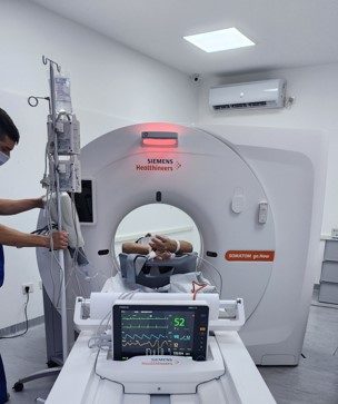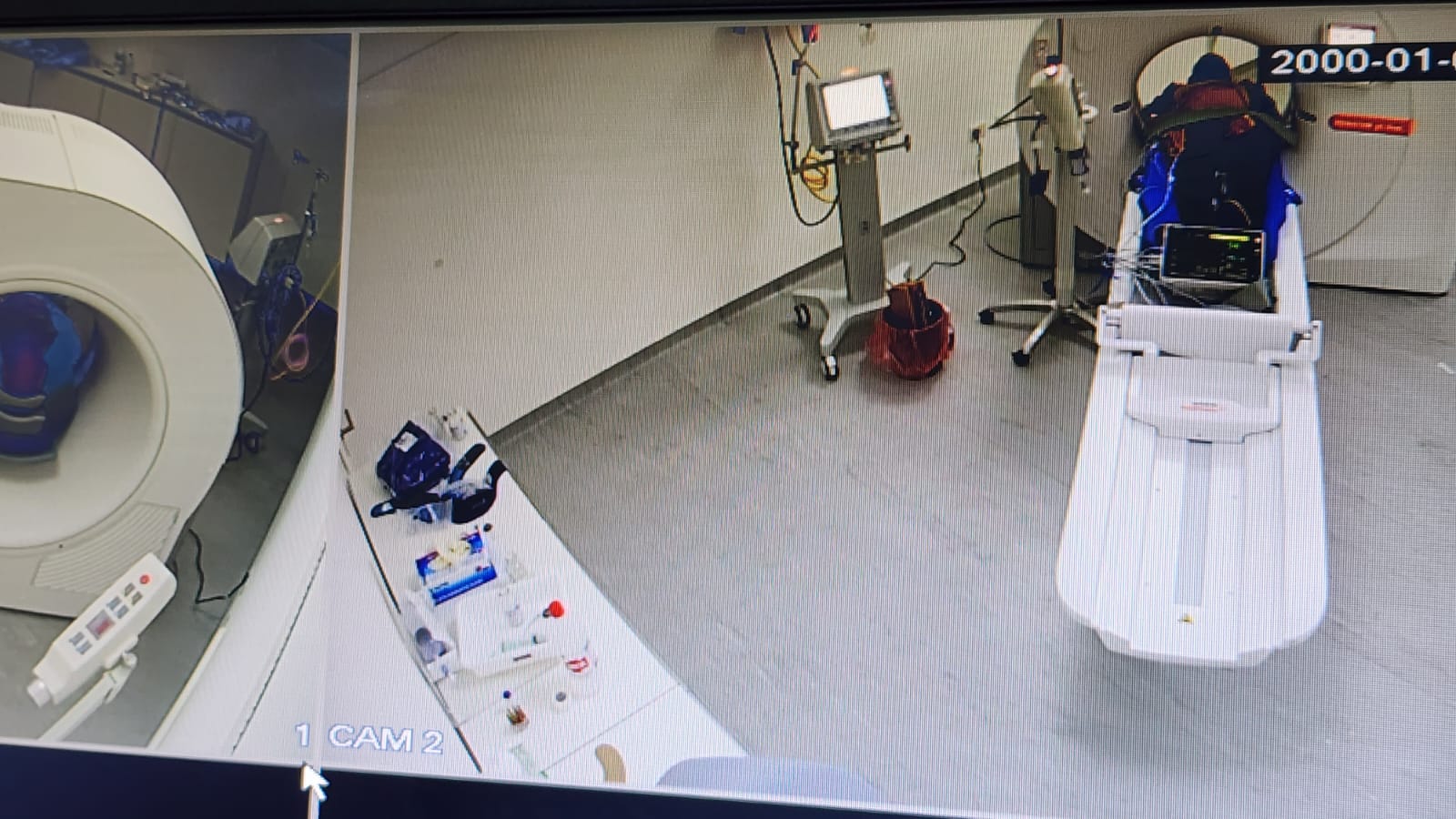 El tomógrafo en emergencias es un Tomógrafo Multislice Siemens Somatom Force de 16 filas que está dispuesto en una sala específica con la protección correspondiente (Ref 2 en plano). Presenta acceso directo desde el corredor central de la sala de emergencias (Ref 3 en plano) al que se ingresa desde el ingreso de ambulancias (E y flechas en el plano) y también presenta un acceso periférico (Ref 4 en plano) para el resto del hospital. La sala de control del tomógrafo se encuentra integrada a emergencias (Ref 5 en plano). Desde la sala de control se cuenta con un circuito cerrado de TV que permite aun mayor monitoreo del paciente.