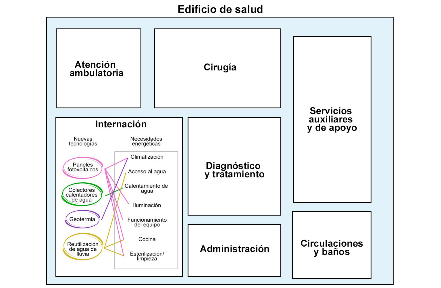 Desde un enfoque analítico los edificios de salud se pueden considerar como establecimientos compuestos por diferentes áreas (Martini 2010 op. cit). En cada área se realizan actividades particulares y se debe cubrir distintas necesidades energéticas relacionadas con climatización, acceso al agua, calentamiento de agua, iluminación, funcionamiento del equipamiento, cocina y esterilización y limpieza, la cuales se detallan en la Imagen 2. Tradicionalmente estos requerimientos se cubren a partir de la utilización de recursos como el gas y la electricidad por red.