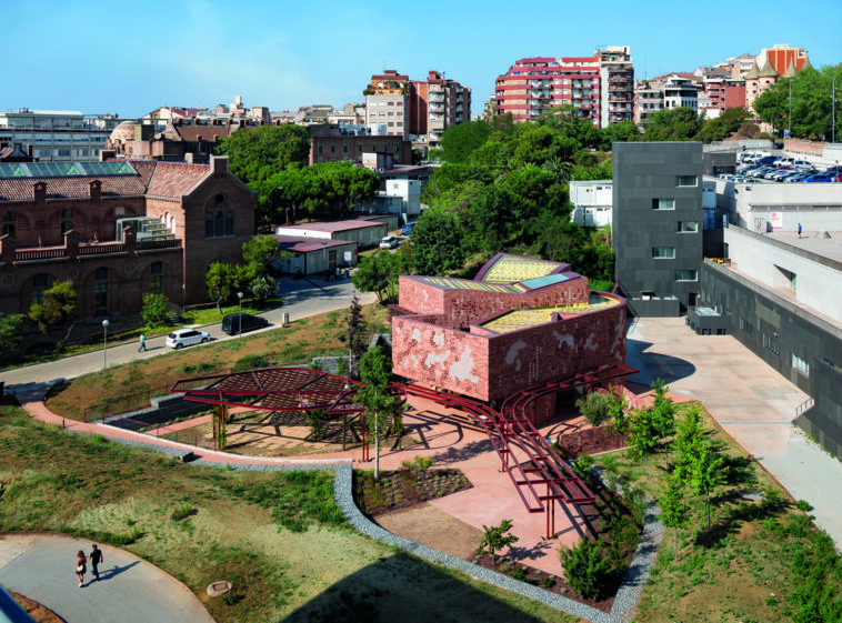 El muro de fachada está construido en ladrillo cerámico con texturas y colores variables, combinado con piezas de cerámica de diferentes geometrías. Estas celosías permiten filtrar la luz, ventilar, controlar las vistas y preservar la intimidad. El muro no es solo una envolvente, sino una extensión del jardín. Su color, textura y composición están inspirados en la riqueza ornamental de los edificios modernistas del recinto, creando una fachada que se integra como una flor dentro del jardín. En palabras que aún resuenan en mí: el proyecto son unas flores de colores dentro del gran jardín del Hospital de Sant Pau.