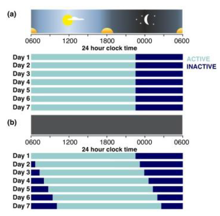Mientras que un ciclo que corre libre, sólo con información endógena del cuerpo, pero no con información exógena se irá desplazando postergándose cada día un poco hasta desincronizarse completamente del día. Como se ve en la figura (b) el ciclo seguirá siendo de 24 horas promedio, pero no estará sincronizado. [4]