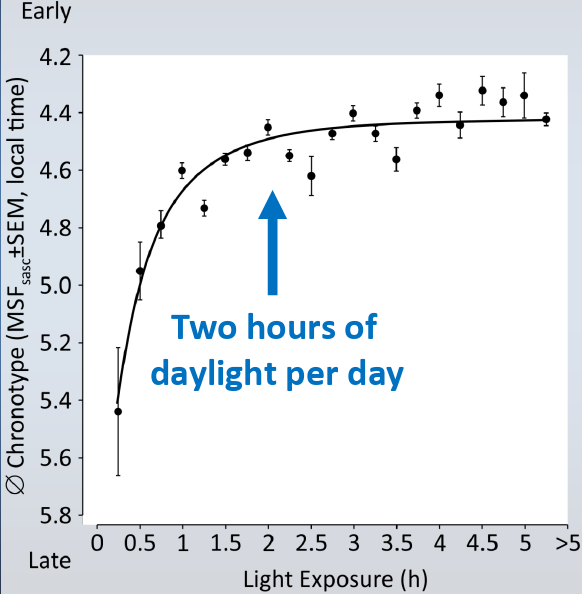 La curva demuestra que menos de una hora de exposición no alcanza para sincronizar el ciclo y que más de dos horas es indiferente para modificar el cronotipo. Por lo que podemos decir que son suficientes dos horas de exposición a la luz solar.