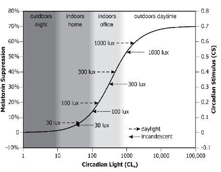 El instituto LRC[5] estableció como criterio que para funcionar en un planteo de iluminación de entrenamiento circadiano dicha instalación debe superar un CS de 0.3. De esto podemos deducir qué sólo la iluminación exterior de día o una iluminación interior de alto brillo pueden funcionar como disparadores del ciclo.