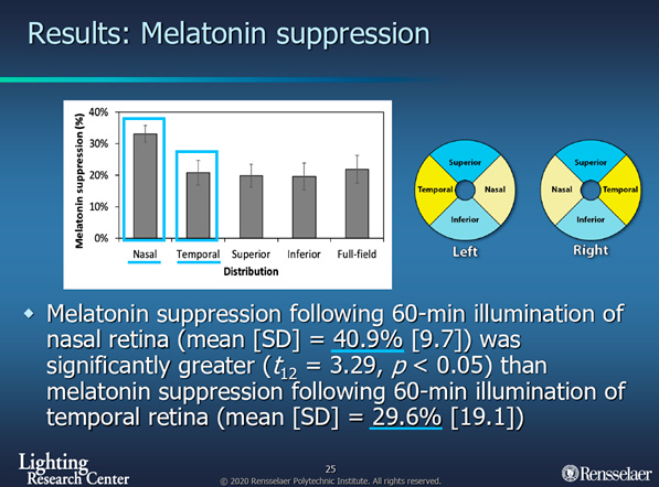 Estos fotorreceptores en la retina (ipRCG) tienen una conexión directa con el cerebro, precisamente con el núcleo supraquiasmático que sincroniza la actividad de la glándula pineal. Podríamos resumir que el ojo según la luz recibida le informa al cerebro la hora del día y según esto el cerebro ordena controlar la producción de ciertas hormonas como la melatonina, que es la hormona que induce al sueño, aumentándola durante la noche y disminuyéndola durante el día regulando el ritmo vigilia-sueño. [3]