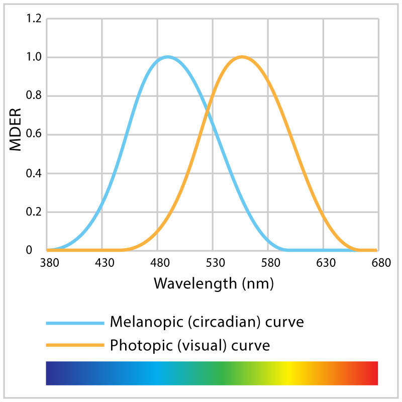 De día (llamada visión fotópica) esta curva tiene un pico máximo alrededor de los 555nm, es decir somos más sensibles a las ondas electromagnéticas que el cerebro reconoce como verdes. En cambio, de noche los conos casi dejan de funcionar y los bastones son nuestra principal fuente de información visual (visión escotópica), podemos reconocer mejor claros y oscuros, pero no decodificamos el color [6]. La curva de visión melanópica, la cual considera la sensibilidad de los ipRGC (células intrínsecamente fotosensibles), se desplaza hacia longitudes de ondas más bajas teniendo su pico máximo alrededor de los 490nm, las longitudes de onda más azuladas.
