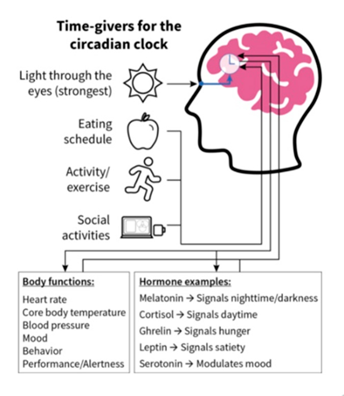 El principal “zeitgeber” (palabra de origen alemán que se utiliza para determinar al sincronizador) es la luz solar, pero el cerebro también recibe información de los alimentos que ingerimos, de la actividad física que realizamos y de los hábitos y actividades sociales.