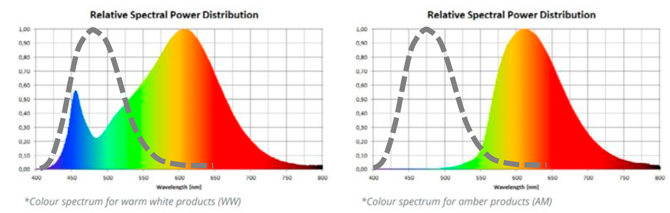 Durante la tarde, cuando debemos dejar de exponernos a la luz, para no retardar el comienzo de secreción de melatonina, es estratégico utilizar luminarias con mayores componentes de ondas ámbar a rojas, del espectro mayores a 600nm. Esta porción de espectro de ondas no es reconocida por la sensibilidad espectral melanópica del ojo, es decir por los ipRGC, por lo que no afectan al ritmo biológico natural.