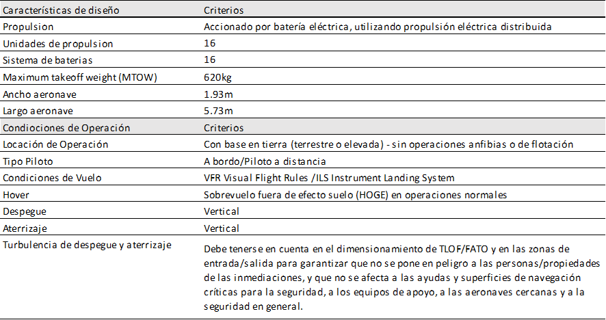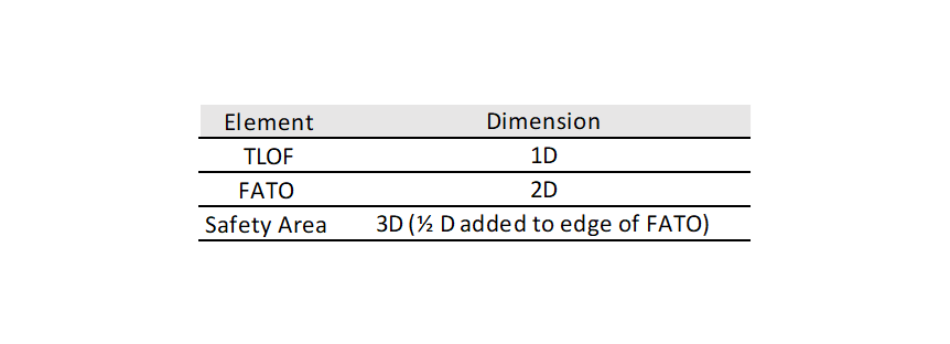 El diseño y la geometría del área de despegue y incluyen el TLOF (Touchdown and Lift-Off Area) Superficie de Contacto Físico para aterrizaje/despegue, la FATO (Final Approach and Takeoff Area) o zona de aproximación final y de despegue, seguida del Área de Seguridad.  Las dimensiones de estas áreas se presentan en la Tabla 2 y se basan en la dimensión de control (D) de la aeronave VTOL de diseño definida para cada instalación vertipuerto.