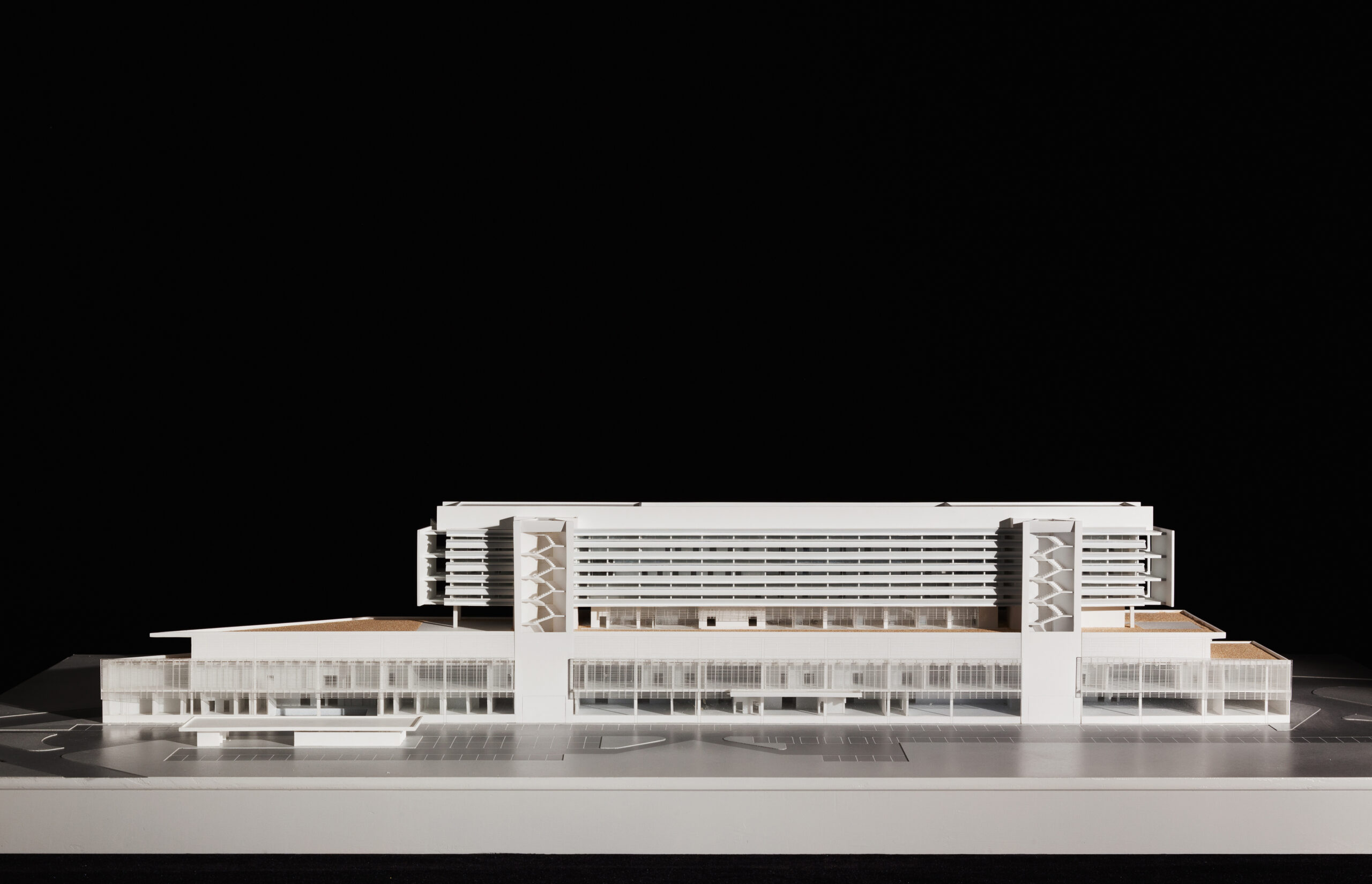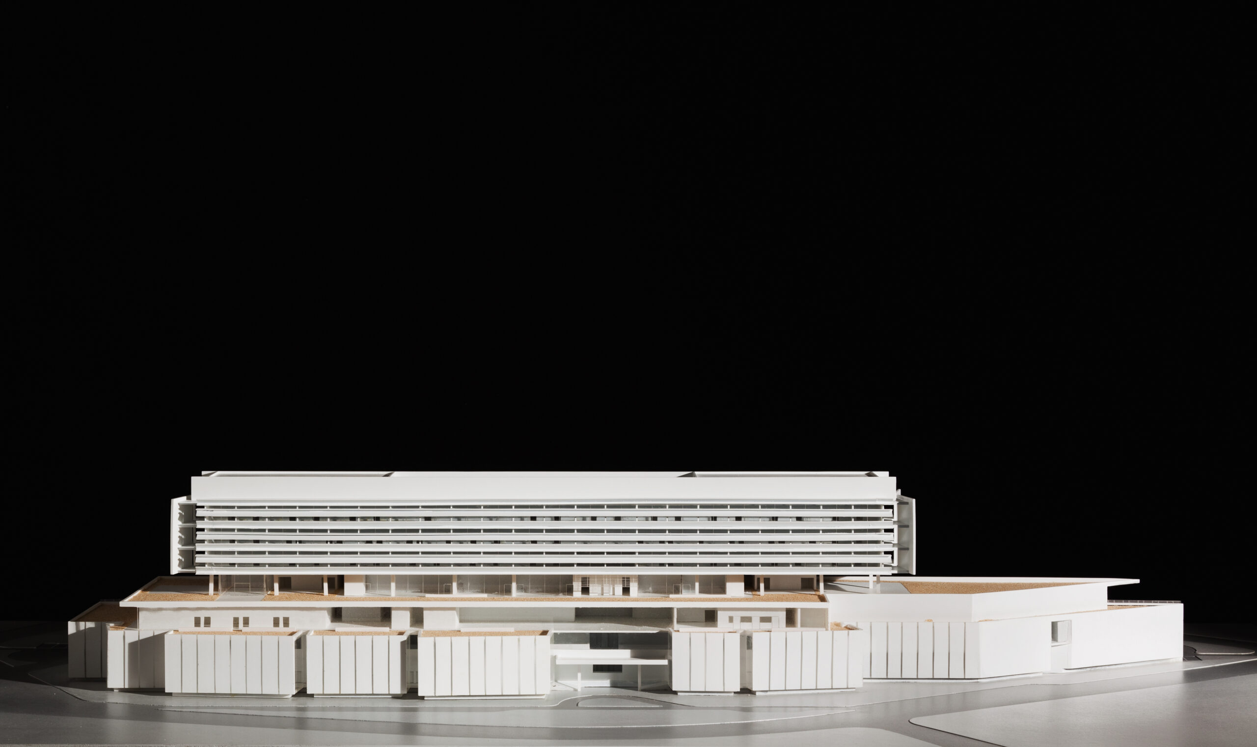 El edificio se dividió en dos grandes volúmenes superpuestos. El basamento, con tres pisos de altura, mide 185 m de longitud por cerca de 35m de anchura. La planta baja es la recepción y alberga todos los programas de primeros cuidados y decisión clínica. Justo encima de él, en el primer piso, están las salas de cirugía, diagnósticos y unidades de cuidados intensivos.