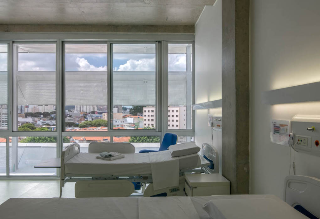 Las grandes ventanas de piso a techo en toda la extensión de la fachada garantizan una generosa luz natural debidamente filtrada por los quiebra-soles. En todas las unidades de atención y en las hospitalizaciones hay previsión de habitaciones individuales aisladas, con reversión de presión positiva o negativa, según la necesidad específica.