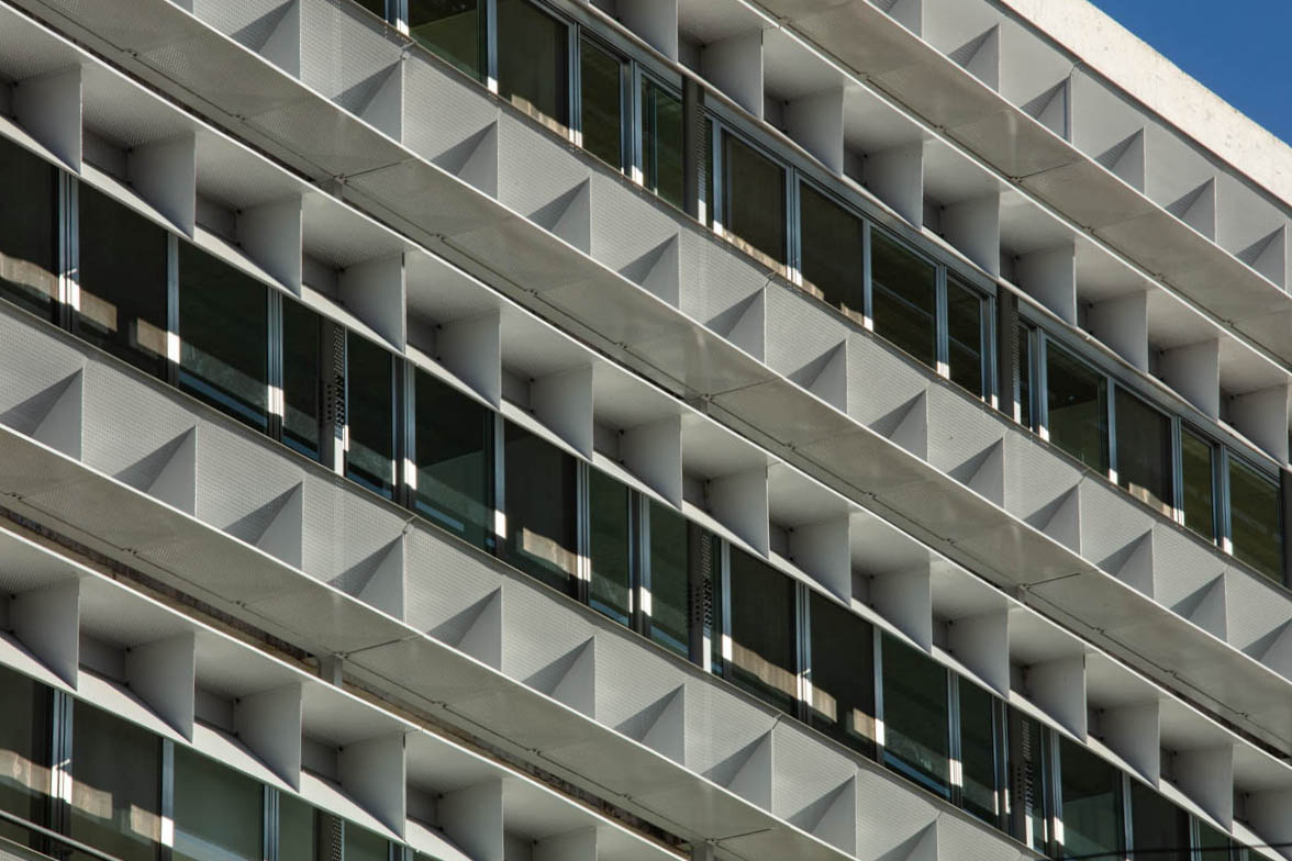 Los voladizos, que definen las dos fachadas laterales, están rematados por pasillos metálicos y quiebra-soles en chapas de acero (5mm de espesor) perforadas y dobladas.