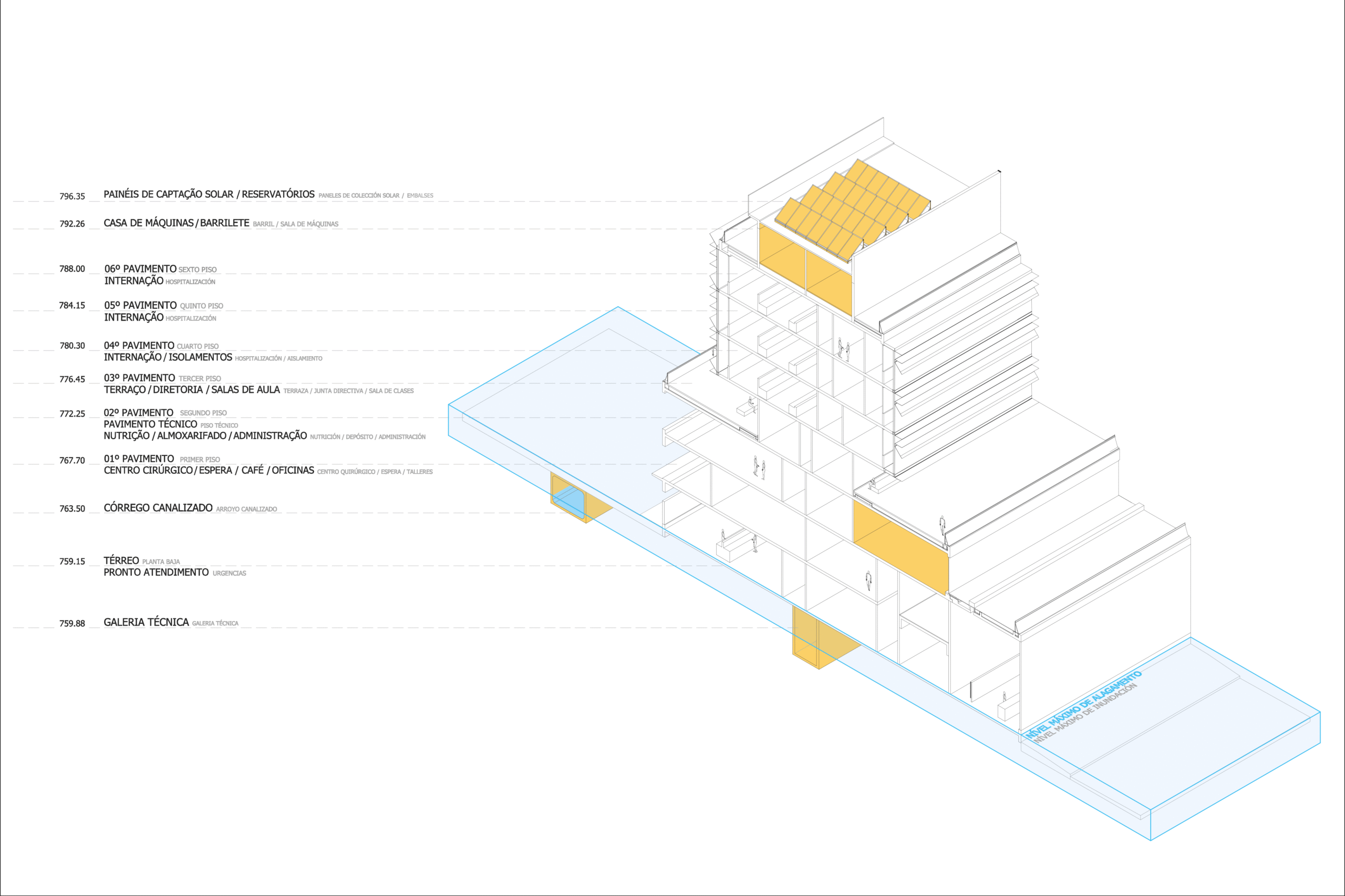 Las máquinas y ambientes de apoyo, que generalmente se encuentran en el sótano, en este proyecto se desplazaron al segundo piso debido al historial de inundaciones en el área de implantación del hospital, que tiene un nivel freático poco profundo y un arroyo canalizado bajo el lecho de la calle Cacilda da Cruz Ferreira.