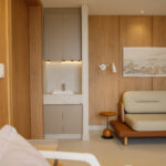 Si bien los muros de las habitaciones que dan a los pasillos podían tener también un aislamiento menor según la Norma, se acordó con el estudio mantener el mismo nivel de aislamiento al ruido aéreo que las divisiones internas. Esto eleva el aislamiento acústico global del espacio y facilita alcanzar los valores en medición “in situ”. Los muros de los baños, que suelen ser relegados en proyectos, fueron cuidadosamente diseñados con un nivel de aislamiento superior al habitual, ya que son colindantes con las habitaciones y allí circulan cañerías con fluidos que generan ruidos.