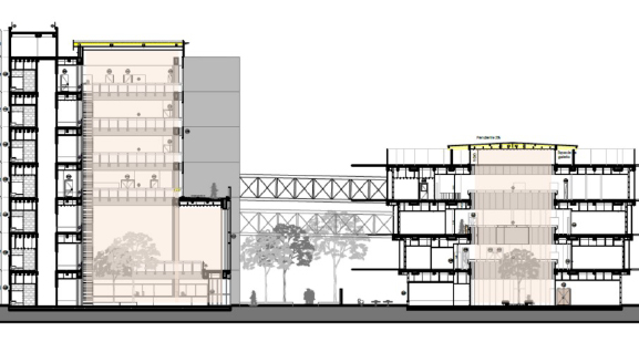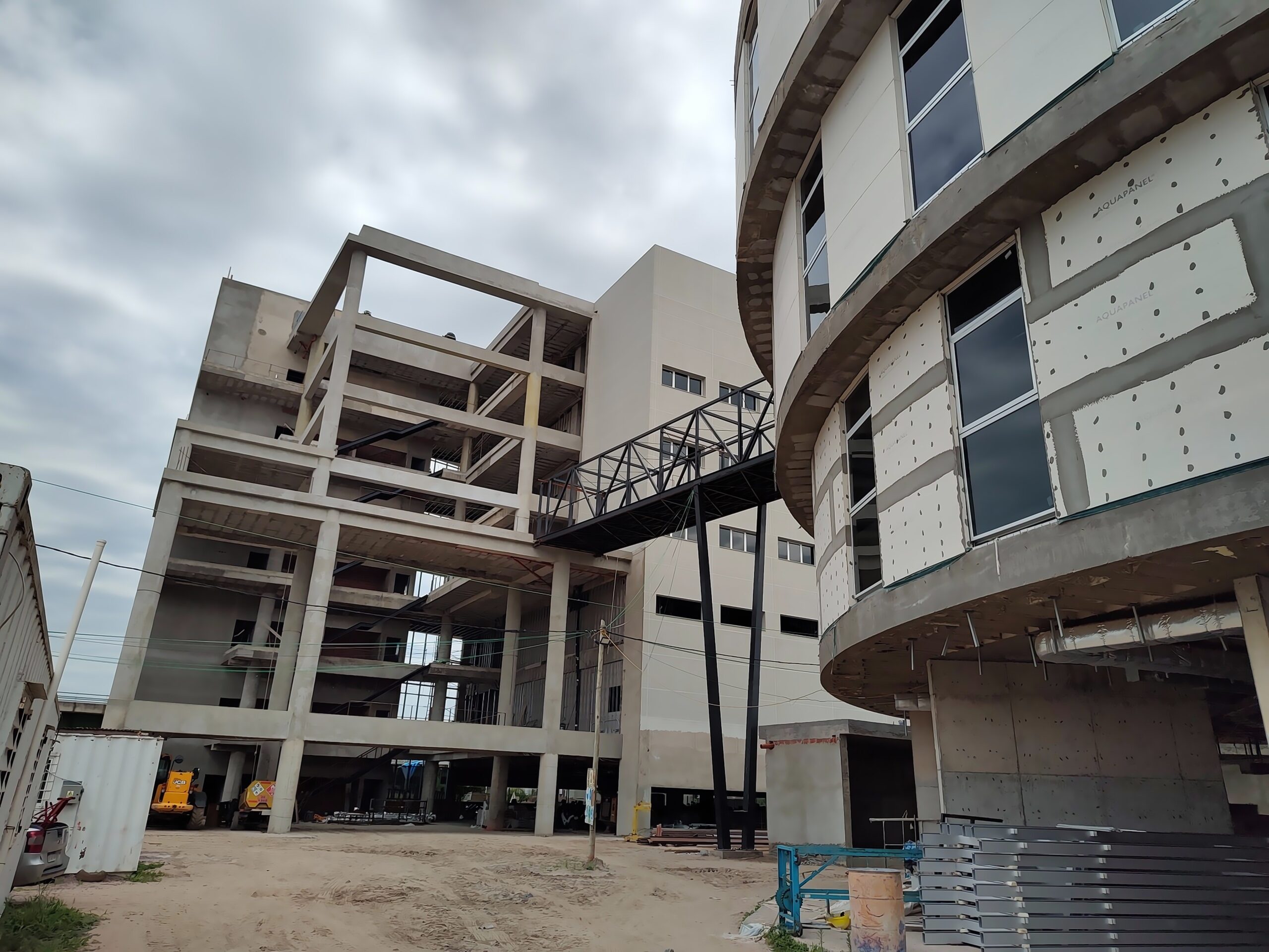El complejo edilicio de gran porte, 17.000 m², está compuesto por dos edificios: hospital y universidad, con plantas de diseño diferente unas de otras. Ambos están conectados por puentes y se espera un alto flujo diario de personas.