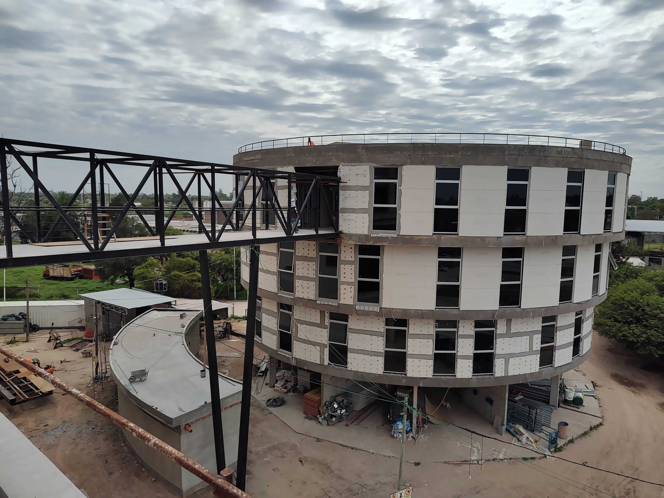 Los muros externos curvos del edificio de docencia se diseñaron en Steel Frame como alternativa al muro tradicional de ladrillo hueco 18 (LH 18). Esto facilitó la obra y, además, permitió alcanzar niveles de aislamiento térmico y acústico superiores, representando un “upgrade” para el proyecto.