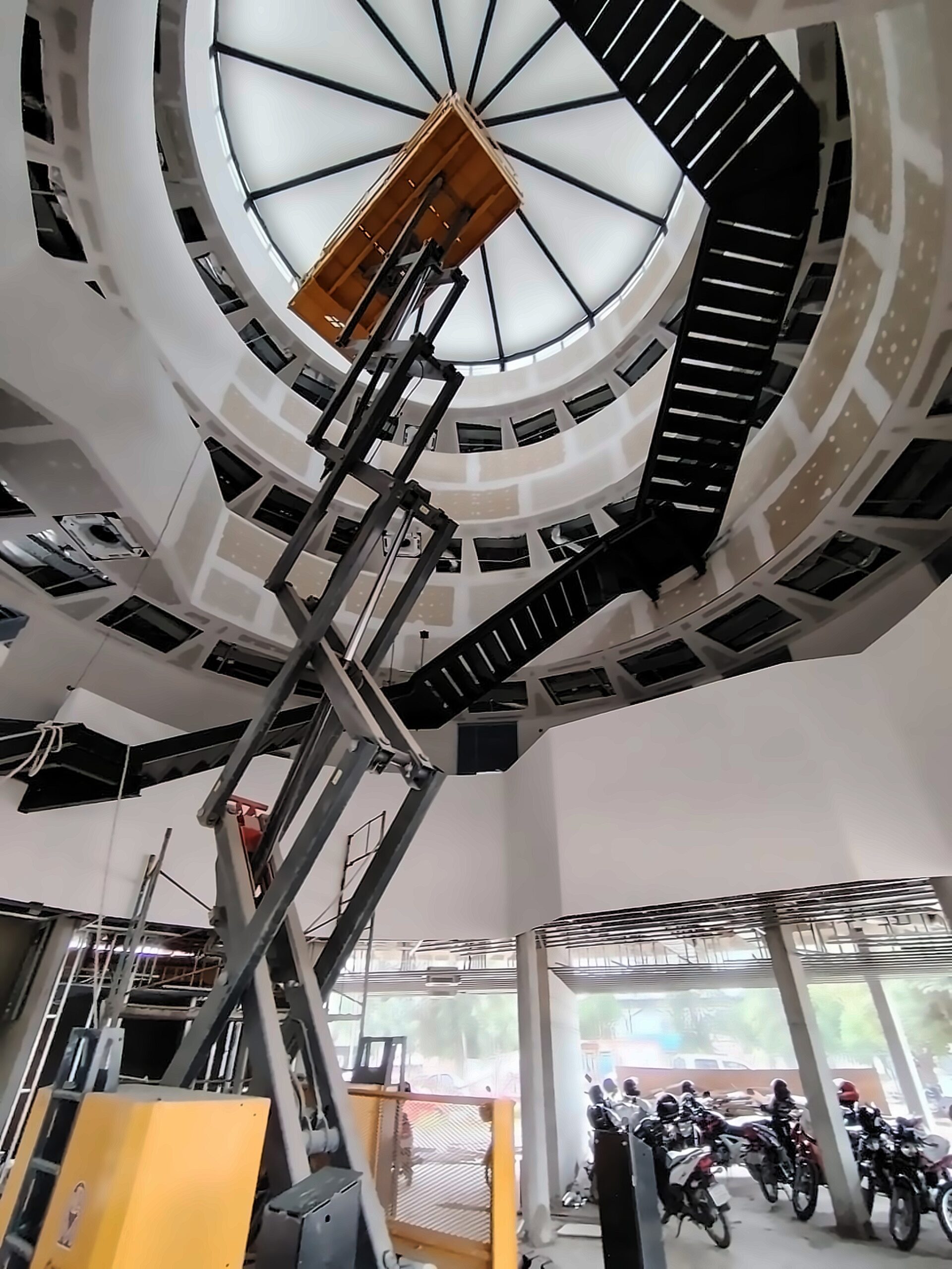 Para el patio central de docencia se propuso un sistema de revestimientos absorbentes sobre los muros de las aulas, con materiales para absorber el sonido en las circulaciones curvas, además de superficies de absorción en los cielorrasos de las circulaciones.