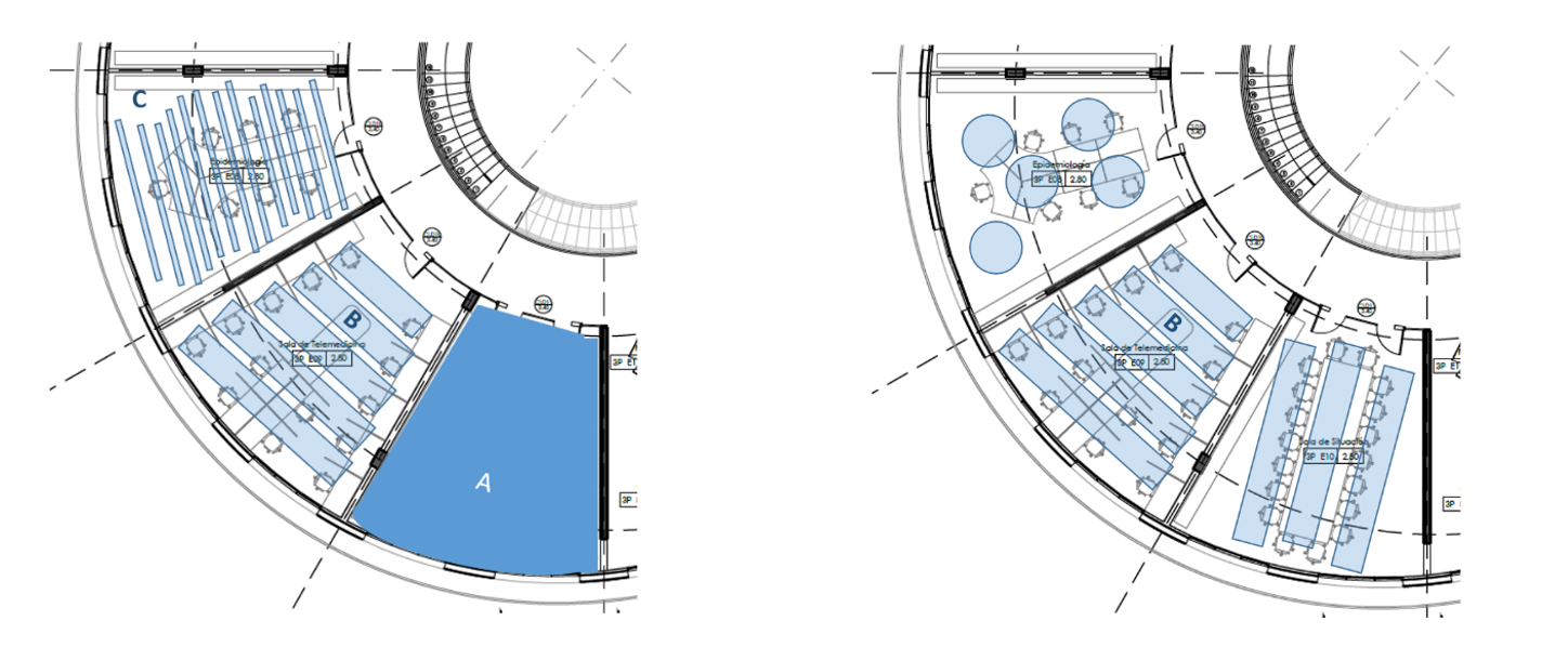 Para el acondicionamiento acústico se propusieron varias alternativas, ya que en este sector se pueden usar materiales más informales en cuanto a estética sin tantas exigencias en cuanto a la asepsia . Dado que las aulas y laboratorios tienen plantas irregulares, se presentaron diferentes opciones para absorción acústica según presupuesto y diseño, que incluyen desde cielorrasos completos con materiales absorbentes hasta islas acústicas o baffles acústicos suspendidos del techo, con o sin iluminación.